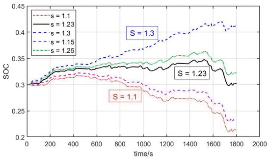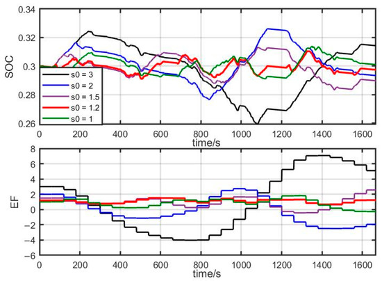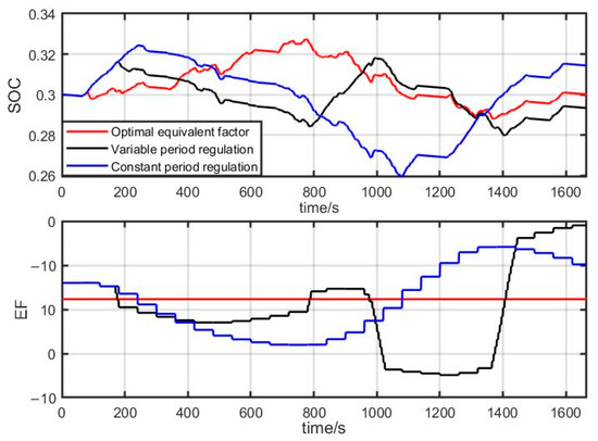 In addition, the value of the initial EF also has an important influence on the final control results. As shown in Figure 9, when the initial EF deviates greatly from the optimal EF and the regulation period is long, the SOC will change greatly in the same direction due to the regulation lag, and the EF will be continuously adjusted in the same direction for a long time. Therefore, the final control results are poor. However, if regulation period is too short, the EF will be frequently adjusted. So that the change range of battery SOC is too small, which is not conducive to the reasonable utilization of battery energy. Referring to the method of dividing the proportional coefficient by sections according to the SOC error range, the adjustment period of the equivalent factor is divided according to the SOC error range, as shown in Equation (8).