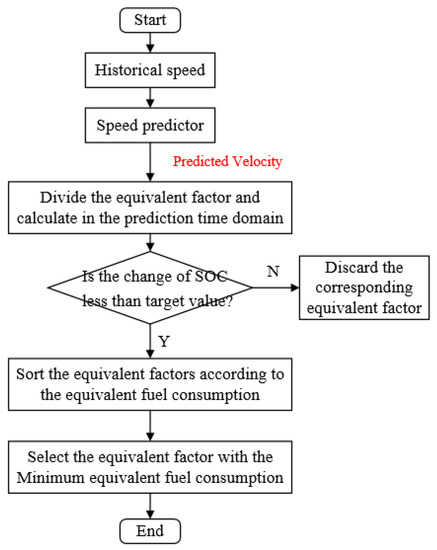 In this paper, the high-precision RBF-NN speed prediction model based on WPT in the previous section is used to predict the future vehicle speed, and then the optimal EF is calculated by using the principle of ECMS. The optimal EF is taken as the value of the EF in actual driving. The calculation process of the optimal EF is shown in Figure 11.