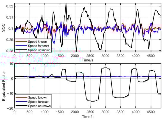 In order to verify that the EF adjustment method based on speed prediction proposed in this paper has a better control effect than the EF adjustment method based on SOC feedback and has good adaptability to different working conditions, the WLCT, UDDS and WVUSUB conditions are selected to form “WUW” condition. As shown in Figure 12, “WUW” operating conditions include various complex operating conditions, which can be used to approximately replace the real operating conditions. Then, ECMS strategies using the two EF regulation methods are simulated under the working condition of “WUW”, and simulation results are compared as shown in Figure 13 and Table 3, and “Speed-known”, “Speed-predict” and “Speed-unknown” represents the EF adjustment methods that are based on real speed, speed prediction, and SOC feedback, respectively.