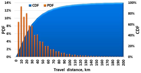 With respect to battery life, a 70% maximum allowable depth of charge is often assumed in the literature; i.e., the battery cannot be charged if the SoC ≥ 90% and cannot be run down if the SoC ≤ 20%. However, the average energy consumption of EVs is about 1.89 kW/km considering different EV models available in the market in 2020. This implies that EVs with a useable energy capacity of 11.34 kWh could account for 85% of PEVs which travel less than 60 km and still do not need a second recharge on the same day. Similarly, EVs with a usable energy capacity of 18.9 kWh or higher can travel about 100 km a day without a second recharge, which comprises 99% of vehicles, according to the data of NHTS. As a result, the probability that the daily travel mileage for an EV exceeds its electric range, considering different EV models available in the current market, is extremely small [