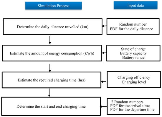 26]: (i) the energy required to charge the battery, (ii) the duration of the charge and iii) the time of the charge. The simulation process to develop the EV charging loads is illustrated in