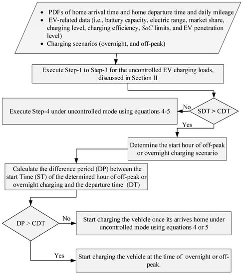 Figure 6 shows the simulation processes for overnight charging (charging that takes place during the night-time hours, typically lasting for seven to eight hours) and off-peak charging (charging that happens at times when there is least demand) scenarios. An important step in these processes is to check the stay duration time at home (SDT) by determining the difference between the arrival and departure times. If the SDT is greater than the charging duration time (CDT), then the EV might start charging at off-peak or overnight periods, based on the time difference between the start time—of the predetermined hours of the off-peak or overnight periods—and the departure time.