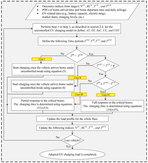 This stage is proposed to investigate the inherent flexibility of EV loads in response to critical hours, and to modify the EV charging load accordingly. To ensure the practicality of the proposed model, the decision to postpone the time of charging during the critical hours primarily depends on the charging flexibility, and should neither violate driver comfort behavior nor cause inconvenience. In other words, two main conditions should be satisfied: (i) the duration of the stay at home is greater than the required charging time and (ii) the charging hours intended under the uncontrolled mode intersect with the critical hours. Essential input to this stage is obtained from the outcomes of the previous stage, which entail the following indices: (i) which denotes the non-critical hours where the feeder can accommodate more EVs for charging and (ii) that denotes the critical hours where some EV loads must be shifted to non-critical hours.