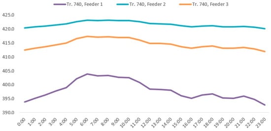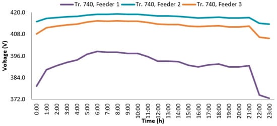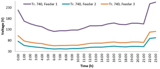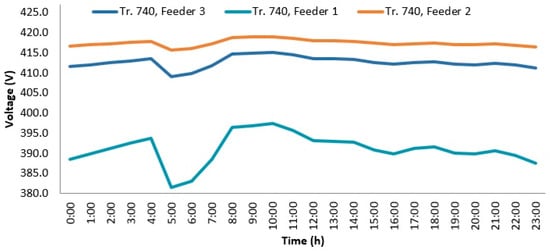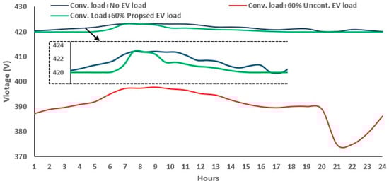 Voltage profiles at the end of Transformer 740 in summer with 60% EVC & off-peak charging.