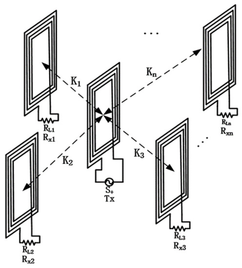 The schematic diagram of the multi load WPT system is shown in Figure 1. The system consists of a transmitting coil TX and n receiving coils Rx. The coupled mode theory is a powerful tool to study the power and efficiency of the system in the strong coupling state [20,21]. The input of the system is S+, and the coupled mode equation of the system can be expressed as follows [22]: