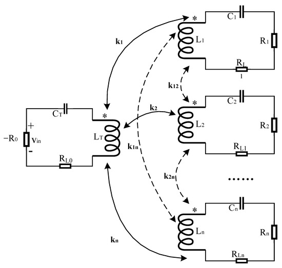 where ωT is the resonant frequency of transmitting coil and ωR is the resonant frequency of the receiving coil. On this basis, we proposed a model for the multi-load PT-WPT system. The circuit structure diagram of the series PT-WPT system with n-loads is shown in Figure 3.