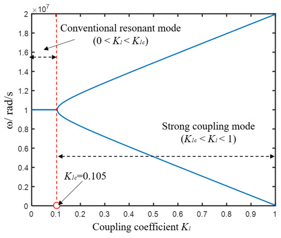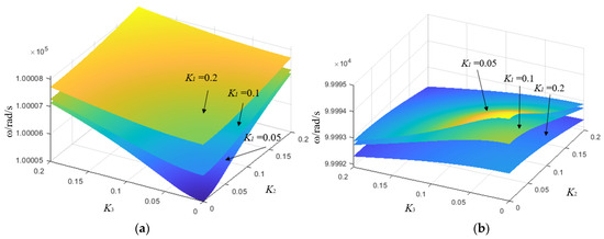 When n = 1, the system is a one-load WPT system. At this time, it does not need to meet the phase condition and impedance matching operation to make the system run at the eigenfrequency. The system can run stably at the exact phase only with a nonlinear initial gain [23]. According to Formula (12), when the resonant angular frequency = 1 × 107 rad/s, Ri = 50 Ω, Li = 50 μH, RLi = 2.5 Ω, and the coupling coefficient K of the three receiving coils varies from 0 to 1. The eigenfrequencies of the PT-WPT system are shown in Figure 4 (Using Matlab 2020b).