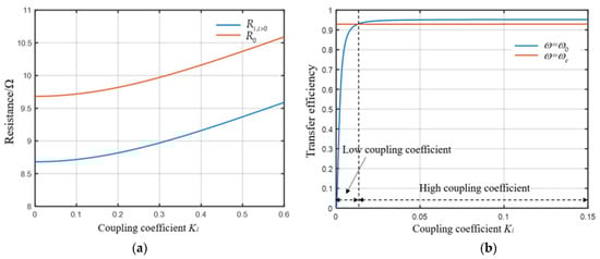 In other words, when the coupling coefficient changes, the resistance parameters of the circuit need to be adjusted to ensure that the PT-WPT system always works at the intrinsic frequency. Combining Equations (16) and (17), we can get the rules of impedance matching as follows: