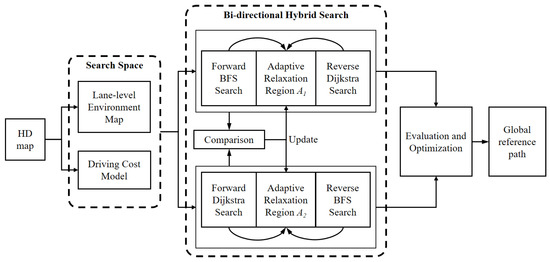 The BHPS algorithm based on HD maps consists of three parts: bidirectional hybrid search in the search space, update of the relaxation region, and global path optimization. First, the global path search is carried out in the search space simultaneously with the source point and the target point. A relaxation region is designed to adjust the path search termination condition of the hybrid search method. After that, the hybrid path search results are evaluated and optimized comprehensively, and the global path search is finally completed.