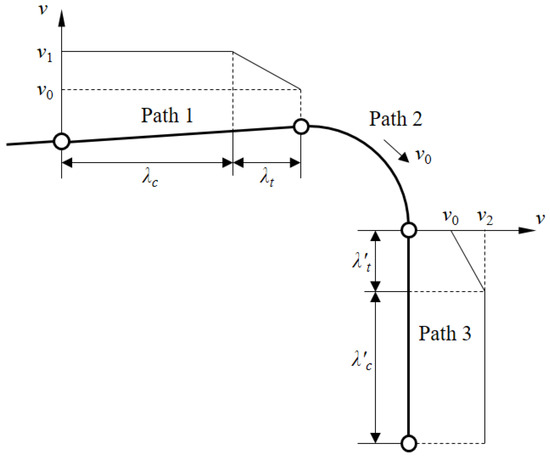 When there is a curvature change between two path segments, there is a variable-speed section with a non-zero acceleration value at the junction of the two segments due to the difference in the expected speed under the different curvature sections. A typical set of path segments is shown in Figure 2, where Path 1 and Path 3 are long, straight road sections and Path 2 is a steering segment between the two straight segments. Because of the speed difference between Path 1 and Path 2, the speed decreases on Path 1 as it approaches Path 2 to match the expected speed of Path 2. Therefore, the travel time cost of the path segment is obtained by adding the travel time cost components of the constant-speed segment and the variable-speed segment: