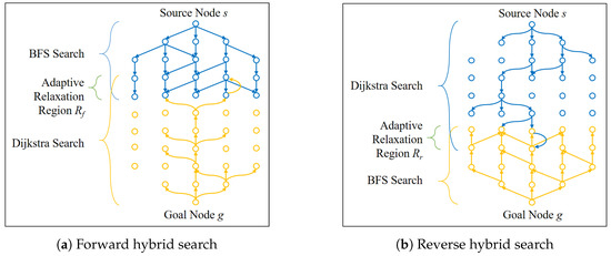 Similarly, a path search of the search space with the opposite mode in the direction from s to g is conducted, as shown in Figure 6b. That is, Dijkstra search of the search space is carried out from s to g, while reverse BFS is carried out in the direction from g to s. Since the road network information is not necessarily symmetric based on s and g, the complexity of the road network near the node s and the node g is not identical. Moreover, the search efficiency of the Dijkstra algorithm is different from that of the BFS algorithm. Therefore, when intersecting nodes occur in the bidirectional search process, two different relaxation regions are generated. The relaxation regions of the two search processes were recorded as and .