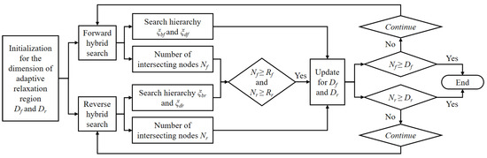 The relaxation region is located around the intersection nodes of the bidirectional hybrid search process, which is the basis for judging the termination conditions of the forward and backward BFS and Dijkstra search processes. The application and updating process of the relaxation region is shown in Figure 8.