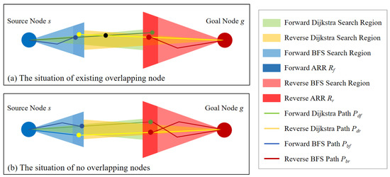 Figure 9b shows the schematic diagram when there are no overlapping nodes outside the BFS search scope. The bidirectional Dijkstra search process generates two expected paths: forward Dijkstra search path and reverse Dijkstra search path . Taking forward Dijkstra search path as an example, the path segment does not reach g but the optimal path between source node s and the reverse relaxation region. For to reach g, the path from the reverse relaxation region to g is supplemented by the reverse BFS optimal path. The Dijkstra optimal path from s to the forward relaxation region is also replaced with the forward BFS optimal path.