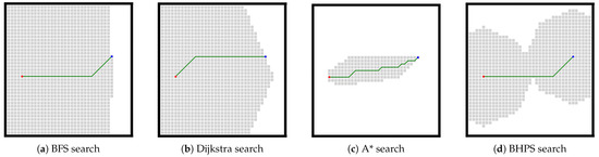 The BFS algorithm is a path search method based on the complete search space and is not affected by the local cost of the path segment. As long as there is a path solution between s and g, the optimal global solution can be obtained by the BFS algorithm. The BHPS algorithm carries out path search via BFS search near s and g and uses the Dijkstra algorithm to supplement the search space in the middle segment of the search space, which greatly reduces the negative impact of local short-distance paths on the global search. Therefore, the BHPS algorithm can usually find the desired global path with less computational complexity than the bidirectional BFS search algorithm.