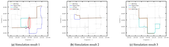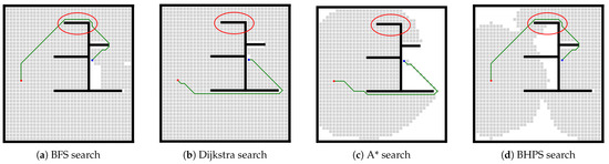 To verify the high efficiency and near-optimal performance of the proposed BHPS algorithm, the bidirectional Dijkstra algorithm, bidirectional BFS algorithm, A* algorithm, and BHPS algorithm are used to carry out point-to-point path searches in the same scene. We find that the BHPS algorithm can generate the desired path in any specified search source node and goal node. The four search algorithms present partial differences, as shown in Figure 14. In some search scenarios, the BHPS algorithm and bidirectional BFS algorithm can find the desired path, while the bidirectional Dijkstra algorithm and the A* algorithm produce unsatisfactory search results. Although the bidirectional Dijkstra algorithm and the A* algorithm have higher search efficiency and can quickly find a passable path from the beginning to the end, the generated path does not match the desired path. During the search process, the Dijkstra algorithm carries out the next search step based on the optimal local solution in each search process. When encountering a shorter path segment with a lower travel cost (as shown in the red selection area in Figure 14a), the Dijkstra algorithm continues to search based on this shorter path segment. That is, even in relaxation operations, the Dijkstra algorithm still tends to select the local low-cost path segment as its next search solution during the search process. However, the local long-distance path segment is the required path in the optimal global solution, so the bidirectional Dijkstra algorithm cannot obtain better results.