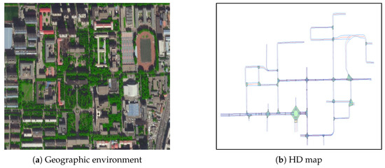 The paper tests and verifies the proposed algorithm based on the HD map of the Nanling Campus of Jilin University. The HD map used in this study is matched with the actual environment of the Nanling Campus of Jilin University (Figure 13a is the geographic environment map of Nanling Campus of Jilin University, and Figure 13b is the HD map matched with it), which is provided by a third-party technology company cooperating with our research group. After gathering abundant static environmental information through sensors (such as RTK sensors, IMUs, lidar, and cameras) in the real world, an HD map with centimeter-level accuracy is produced after fusing the information offline.