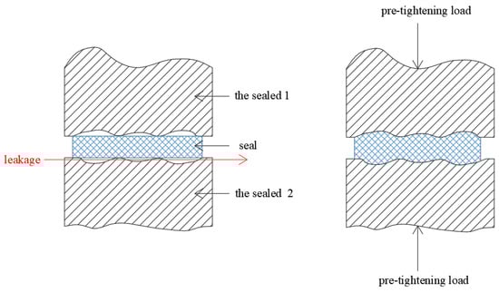 In pre-compressing static sealing, a seal made by rubber elastomers is placed between sealed surfaces. The sealed surfaces are pressed tightly by pre-tightening loads during operation. Compression deformation of elastomer seals can fill leakage channels and achieve the goal of sealing [5]. Pre-tightening loads should constantly be provided during operation to ensure the compression deformation of the elastomer seals, as shown in Figure 2. When the pre-tightening load increases to a certain value (F0) [6], the leakage rate will basically remain stable, and the interface leakage can be blocked effectively, meaning a better sealing performance can be achieved [7]. However, the viscoelastic property of polymers can induce stress relaxation of seals under constant strain because of chain rearrangements, oxidation, chain scission and additional crosslinking, which lead to a loss of compression deformation over time. In other words, compression stress relaxation reflects the loss of sealing force over time. Therefore, if F0 is used as the pre-tightening load, the compression deformation will not be enough after long-term use. In summary, the advantages of pre-compressing static sealing are mature processes, easy operation and easy disassembly. One of the disadvantages is that sufficient pre-tightening loads should be provided. Moreover, the lifetime of seals is limited by the viscoelastic property of polymers.