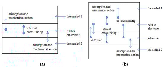 In adhesive static sealing, the liquid elastomer sealant is poured into the channels between the sealed surfaces. The liquid elastomer sealant has good fluidity and wettability before its vulcanization is completed, which allow the surface gaps to be fully filled. After vulcanization, the sealant and the sealed surfaces are bonded together, inseparably, and leakage paths are eliminated. The main applications of adhesive static sealing include form-in-place gaskets [8] and pouring sealants. In adhesive static sealing, bonding is formed between the liquid elastomer sealant through a crosslinking process, and the cohesive strength is produced, as shown in Figure 3a. If an adhesive is applied between the liquid elastomer sealant and the sealed surfaces, adsorption and mechanical interlocking are formed between the adhesive and the sealed surfaces through wetting effects. Meanwhile, bonding is formed between the adhesive and the liquid elastomer sealant through diffusion, penetration and co-crosslinking processes. The cohesive strength is produced through internal curing reactions of the liquid elastomer sealant and adhesive [9], as shown in Figure 3b. Compared to pre-compressing static sealing, the sealing ability of adhesive static sealing does not depend on the compression deformation because of the liquidity of the liquid elastomer sealant. Thus, there are three main advantages of adhesive static sealing. First, the value of the pre-tightening load can be smaller. Second, the factors which affect compression deformation performance, such as stress relaxation, creep and elastic fatigue, can be ignored [10]. Third, the dimensional accuracy of the sealed surfaces can be lower. Thus, higher sealing reliability and a longer sealing life can be achieved. The disadvantage is that the processes are complex. Moreover, adhesive static sealing is a type of non-detachable sealing, which makes it difficult to adjust the relative positions during the assembling process.