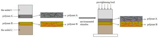 We propose the scheme of the implemented sealing processes of alterable static sealing in this section. Firstly, we modified two sealed surfaces, one with polymer A and the other with polymer B (or modified two sealed surfaces and the rubber elastomer gasket between them with polymer A and polymer B). Two solid polymer layers were formed on the two sealed surfaces. Secondly, the pre-tightening load was applied to the sealed surfaces, and its value was smaller than that used in pre-compressing static sealing. Thirdly, an environmental stimulus was employed on the sealed surfaces. On the interface, the diffusion was intensified, and stable chemical bonds were formed between the terminal reactive groups of polymers A and B. Therefore, the interaction on the interface could be enhanced, and bonding strength could be produced within the sealed elements, as shown in Figure 5.