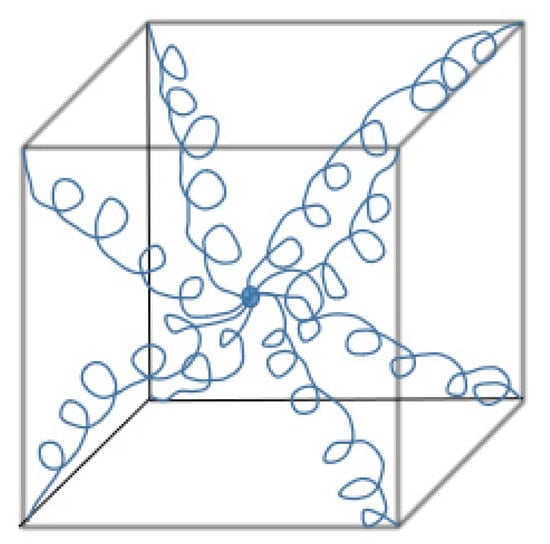 The polymer networks in alterable static sealing include the crosslinked polymer networks A and B, and the interpenetrating network at the interface. Here, we used the Arruda–Boyce model to model networks A and B. The Arruda–Boyce model assumes that the polymer chains have the same length and self-organize into body-centered eight-chain structures [35], as shown in Figure 7.