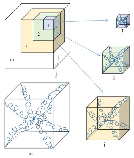 Next, we established the model of the formation processes of the interpenetrating network between the interface. We assumed the chain lengths of polymers A and B are inhomogeneous. Polymers A and B are composed of m types of networks interpenetrating in the material bulk space. In each unit cube, the polymer chains can be established in the Arruda–Boyce model [36]. In this model, we ignored the effects of chain entanglement and chain crosslinking.