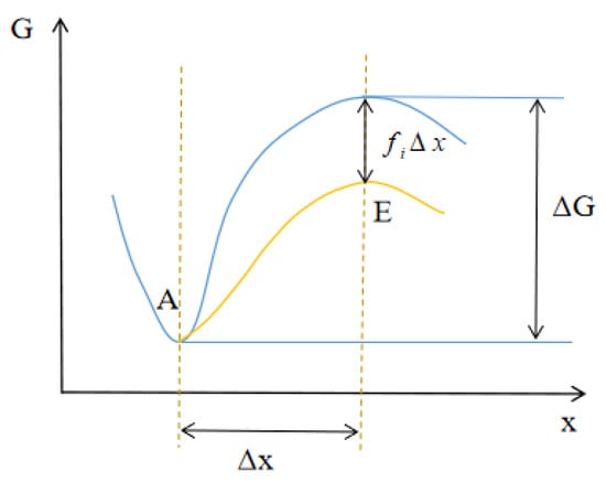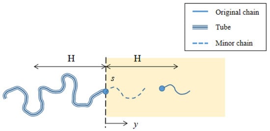 In order to model the penetration of chains, the Stokes–Einstein model was used to assume the diffusion of the ith chain. We assumed that the polymer chains diffuse along their contour tube analogous to the motion of a snake. This curvilinear motion is characterized by the Rouse friction model. We assumed the environmental stimulus promotes the diffusion of the chain segments by , which is the projection of force F to the coordinate s of the tube. We constructed two coordinate systems: s denotes the curvilinear path along the minor chains, and y denotes the linear coordinate perpendicular to the contact interface. In the Rouse friction model, the curvilinear diffusion coefficient of the ith chain is written as
