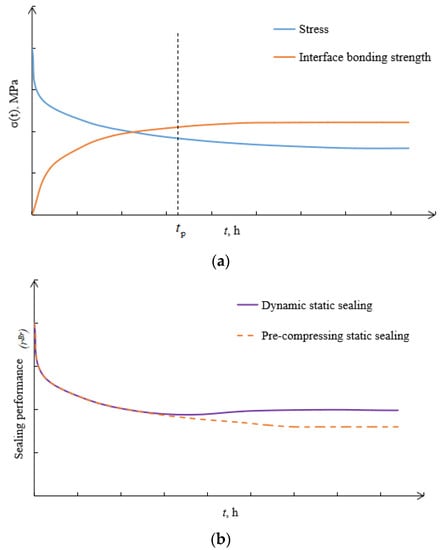 Schematics of the mathematical model of alterable static sealing: (a) the stress relaxation behavior (blue) and the interface bonding strength of the interpenetration region around the interface (orange); (b) sealing performance () of alterable static sealing (purple) and pre-compressing static sealing (orange).