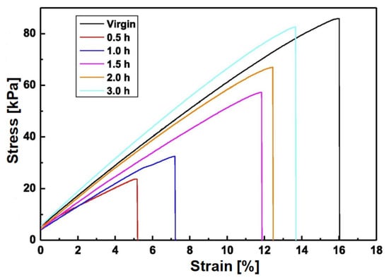 In [42], CuCl2-loaded polybutadiene rubber was employed. Two pieces of rubber were bonded under the manipulation of ultraviolet rays (40 mW/cm2) because disulfide metathesis occurred. The stress–strain curves of specimens under different bonding times are shown in Figure 12.