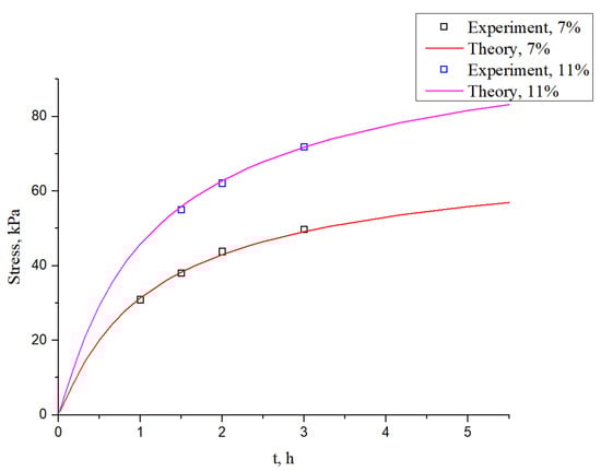 Figure 13 shows both the theoretical simulation values and experimental results of the interface stress at two different deformation ratios (7% and 11%). As the bonding time increased, the interface stress gradually increased, and the growth rate gradually slowed down. The experimental values and the theoretical values show good agreement overall. Because some necessary simplifications have been made in the theoretical model, and the effects of chain entanglement and chain crosslinking were ignored, there were some deviations. When the bonding time is longer (such as 3 h in this example), the diffusion of segments at the interface is deeper, and there are more reactions of the terminal reactive groups. Both of them promote the degree of chain entanglement between the surfaces and the increase in chain co-crosslinking. Therefore, under a longer bonding time, the theoretical simulation values are slightly lower than the experimental results.