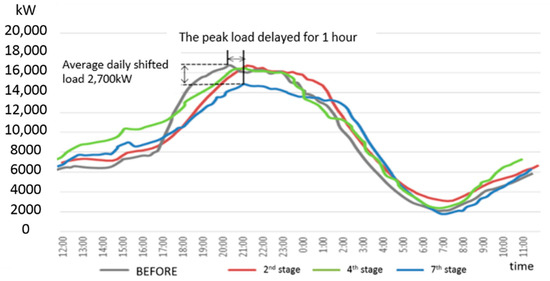 The effects of aggregated load regulation are also remarkable as shown in Figure 1. With the increase of incentive subsidies (from 0.1 ¥/kWh for the 2nd stage to 0.4 ¥/kWh for the 7th stage), the effect of peak shaving and valley filling is remarkable. The daily peak load shifted 2700 kW, and the peak period is delayed for 1 h.