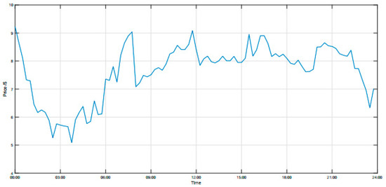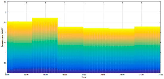 The optimal decisions of aggregator are shown in Figure 2 and Figure 3. Consider the results in Figure 2, we can see the aggregator’s bidding size and sustainable operating duration meet the market access requirement by collecting distributed resources. Response capacities in different colors are from different users. During daytime, for example 8:00 to 20:00, the aggregated reserve capacity is limited, because there are limited available EVs. While in night (00:00–8:00, 20:00–24:00), much more EVs corrected by distribution network are aroused for reserve service. Referring to Figure 3, the purchase prices in 8:00–20:00 are also high, encouraging end users to provide reserve capacity.