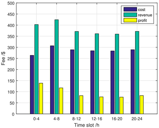 Figure 4 shows the aggregator’s cost, income and profit. It can be seen that the aggregator can earn the intermediate price difference in this transaction process. Besides, the aggregator gains higher profit when EVs are idle (00:00–8:00, 20:00–24:00). The result verifies the effectiveness of the model. The aggregator can effectively gather idle EV capacity to participate in the ancillary market as well as make profits.