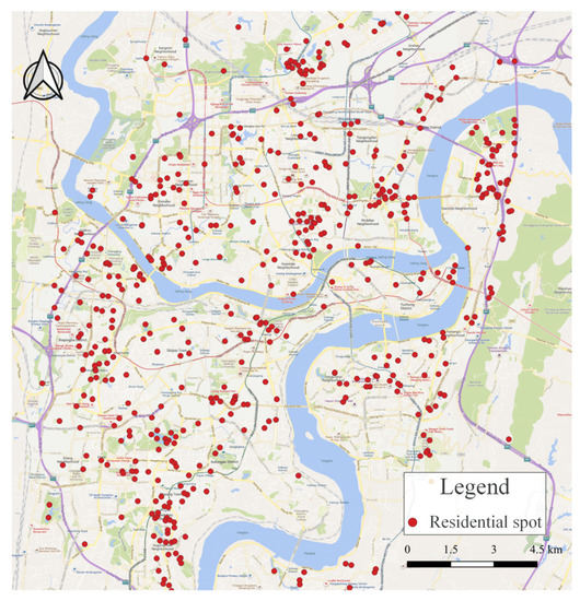 In May 2021, our research group conducted a questionnaire survey in the main urban area of Chongqing to improve the enthusiasm of respondents by issuing vouchers. The questionnaire adopted an offline survey method to record the subjects’ socioeconomic and demographic characteristics, EV mileage data, and residence location information. To obtain detailed coordinates of the residence, the local survey provided special electronic devices for subjects to mark their location on an online map. Additionally, according to the online map positioning provided by the interviewees, data regarding the degree of land use mix and charging pile density were obtained using a web crawler. ArcGIS was used to establish the relevant road network buffer, and the road network density and intersection density were calculated by processing the buffer. The distribution of the longitude and latitude coordinates is shown in Figure 1. It can be observed that the survey sample is evenly distributed, covering all streets in the main urban area of Chongqing. A total of 873 samples were collected, and the number of questionnaires was calculated to meet the research requirements [23]. After excluding abnormal samples and invalid travel samples, 754 valid samples remained, with an effective rate of 86.37%.