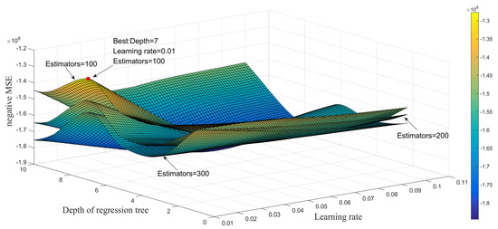 The cross-validation function in scikit-learn uses a utility function (bigger is better) rather than a cost function (smaller is better); thus, the model evaluation function is a negative MSE function. All of the combinations of these three groups of hyperparameters are enumerated by the GridSearchCV, generate plenty of GBDT model variants, and calculate their MSE. We visualize this process, and it can be observed that the highest point in Figure 2 (the red dot on the graph) is the model with the smallest MSE; hence, we adopted this model variant as the final model, and the model hyperparameters in this study were as follows: the maximum number of regression trees was 100, the depth of regression trees was 7, and the learning rate was 0.01.