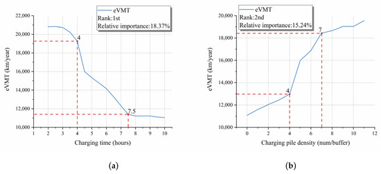 The relationship between the eVMT and EV charging characteristics is described by the charging duration and the charging pile density. Among the influencing variables of the eVMT, the charging characteristics of the EVs are the most important, with the charging duration having the greatest influence (18.37%) and the charging density having the second greatest influence (15.24%), indicating the cumulative importance of the two indicators reaching 33.61%. As shown in Figure 3a, for EV users, the charging time has a significant negative impact on the driving mileage of EVs. The longer it takes to charge an electric car, the fewer owners will use EVs. Additionally, the influence of the charging duration on the eVMT has a prominent threshold effect. When the charging duration is between 4 h and 7.5 h, the eVMT decreases the most sharply, and the eVMT fluctuation range reaches 8000 km/year, indicating that people are most sensitive to the charging duration during this period. The eVMT showed a slowly decreasing trend from 2 to 4 h and 7.5 h later. This confirms that the slow promotion process of EVs is largely due to the limitation of the current charging time of the EVs, which is consistent with most of the conclusions from the current literature. Figure 3b shows that the charging pile density is positively correlated with the eVMT. Moreover, it can be observed from Figure 3b that, within the range of 4–7 num/buffer, the eVMT changes the fastest, indicating that EV owners are the most sensitive in this range. When the density exceeds 7 num/buffer, eVMT maintains a slow but steady growth, further reflecting the promoting effect of the charging pile density on EV use. Therefore, according to the numerical analysis, it is suggested that the charging pile density is controlled within the range of 7 num/buffer, which is more conducive to the development of EVs.