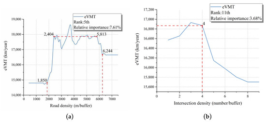 Relationship between traffic design and eVMT: (a) Road density with eVMT; (b) Intersection density with eVMT.