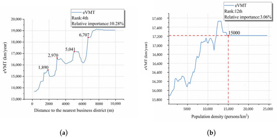 When the eVMT is described by the actual distance between the traveler’s residence and the nearest business district, it can be observed from Figure 5a that the relationship between the distance to the nearest business district and the use intensity of EVs is a zigzag graph and is positively correlated with the overall trend. In terms of importance data, it ranks fourth among the 12 variables, accounting for 10.28%, indicating a relatively high importance. When the distance is within 8 km, there is an obvious threshold effect between the distance (to the nearest business district) and the eVMT, and an overall trend of a positive correlation. Within 8 km, the eVMT reaches small peaks at 1.89 km, 2.97 km, and 5.04 km, respectively. The fluctuation of these three small peaks is mainly related to the bus service level and land use diversity near the residential area, and the existence of such factors leads to an increase in people’s willingness to travel by non-EVs. When reaching 6.7 km, the growth rate of the eVMT slows down, indicating that the travelers’ sensitivity to the business circle distance gradually decreases at this stage. After reaching 8 km, the influence of this indicator on the eVMT gradually disappears, mainly because the increase in the EV travel cost caused by the long-distance business circle exceeds the acceptable range of owners. In terms of population density, it had the lowest importance (3.06%). As shown in Figure 5b, with an increase in population density, the eVMT exhibited a sharp and unstable growth. When the population density reaches 15,000 persons/km2, the influence of the eVMT reaches saturation and remains at a stable value of approximately 17,200 km/year, which suggests that the positive impact of the population density on the EV use intensity is within the limit of 15,000 persons/km2. This is mainly due to the increase in the public transport load caused by the growth of population density and the increase in people’s preferences for private car travel under the change of demand relationship. Although there are fluctuations, the curve trend is mainly positive, reflecting that an increase in the population density promotes the use intensity of EVs.