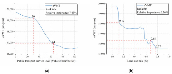 Influence of public transport service level and land use mix on eVMT: (a) Public transport service level with eVMT; (b) Land-use mix with eVMT.
