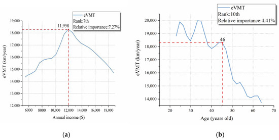Demographic variables were calculated using annual income and age, among which annual income had a medium influence on eVMT, whereas age had a low influence. From Figure 7a, for respondents with an annual income of less than USD 11,958, the higher the annual income, the higher the eVMT, and the growth trend showed a step-growth. For people with an annual income of more than USD 11,958, the higher the annual income, the smaller the eVMT, and the corresponding image slope is relatively stable. There are two main reasons for this difference: people with an annual income of less than USD 8000 have a relatively low income, and the use intensity of EVs is slightly lower than that of people with higher income levels due to the travel cost limitation of EVs. In contrast, people with an annual income above USD 11,958 have more travel vehicle choices than people with an income level below USD 11,958. Therefore, under the condition that people have a higher income, the eVMT of a single EV of a crowd will be lower. From Figure 7b, the use intensity of EVs used by the group younger than 46 years of age is relatively irregular, and the eVMT remains within the range of 18,000–20,000 km/year. However, for the group over 46 years old, the use intensity of EVs decreases significantly, and there is a nonlinear relationship in which the use intensity of EVs decreases with age. The main reason for this is that young people are more receptive to new things and technologies than older people.