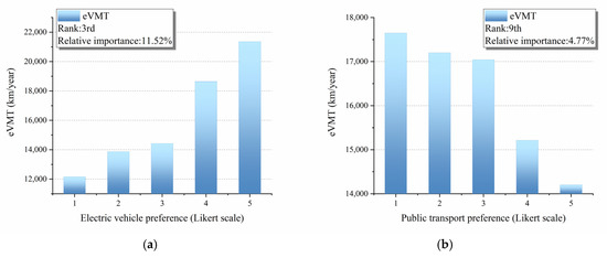 Figure 8 shows the impact of two different travel mode preferences on the eVMT using a five-point Likert scale to measure both variables. Among them, the EV preference has a high degree of influence on the eVMT, accounting for 11.52%, ranking third. In contrast, public transportation preference ranked ninth with a 4.77% importance. The scale from 1 (1 indicates that the individual has no preference for this travel mode at all) to 5 (5 indicates that the individual has a significant preference for this travel mode), indicating an increase in the corresponding preference degree. From Figure 8a, the preference of EVs has a significant promotion effect on the use intensity of EVs, whereas in Figure 8b, the preference for public transportation has a significant hindrance effect on the use intensity of EVs. The similarity between the two images is that the eVMT starts to change significantly at the critical value in Table 3, but the difference lies in the different mapping ranges. The range of preference mapping for EVs is 12,000–22,000 km/year, whereas that of public transportation is 14,000–18,000 km/year. This result further reflects the difference in the importance of the two different preferences when acting on the eVMT.