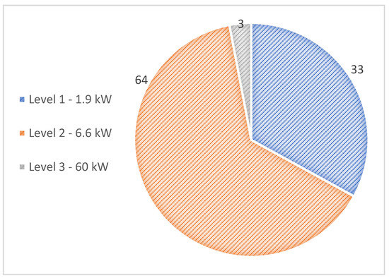 This study assumed a battery capacity of 24 kWh (Nissan Leaf 2013) as an average representative of all EVs. For statistical modeling, the EV and its charging characteristics are arbitrary. Regarding the type of charger, a survey study performed in the Salt River Project service area (in Arizona, U.S.) by the EPRI showed that 66.7% of charging events occur using Level 2 chargers [38]. Level 1 and DC fast-charging event occurrences were 32.5% and 0.9%, respectively. Therefore, we assumed that the EV fleet will employ the percentage of each charger portrayed in Figure 1. For the statistical models being created, the battery capacity and distribution of charger types were definable variables (i.e., they are not constrained to the numbers mentioned above).