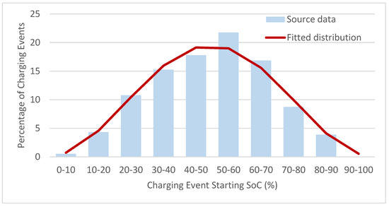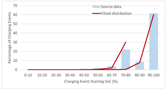 A histogram showing EV battery state of charge at the end of charging events (i.e., target state of charge) taken from the EV Project [40], along with a fitted beta distribution, is shown in Figure 3. Note the two peaks in the data, one at 70–80% SoC and the other at 90–100% SoC. The double peak occurs because 80% or lower was the target SoC. A faster charging rate happens below 80% for lithium-ion batteries. However, more than two-thirds of the charging ended with an SoC above 80%, and more than half above 90%. Beta distributions were once again found to fit the data best, and in this case, two beta distributions were used, one for the range 0–80% of SoC ( and ) and another for the range 80–100% of SoC ( and ). Again, at 95% confidence, the lowest difference from the observed and predicted values for the final SoC came from using two beta distributions with a chi-square test value of 371.