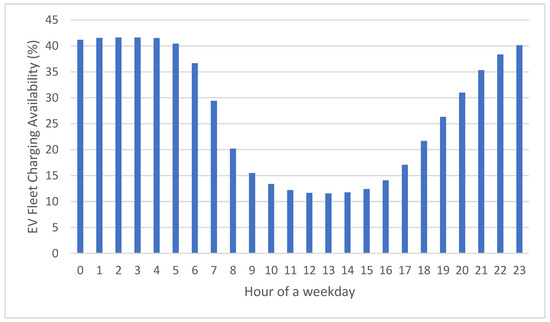 Charging “availability” is defined here as the period when the charger for an EV is connected to a vehicle and is able to charge. The EV Project data include charging availability at home, at work, and at public locations. A chart showing the charging availability data for each hour of the day on an average weekday is provided in Figure 4 [41]. Of the charging events, 85% occurred at home, with just above 40% availability during the night-time hours, and between 10% and 15% during daytime working hours. As the distribution of charging availability data can vary significantly between different regions of a country, or between different countries, it was not fitted to a statistical distribution but was directly used. In the EV charging models implemented below, a distribution such as this is necessary to determine the charging load profile.