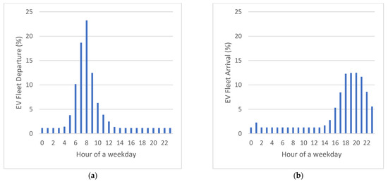 EV availability in the EV Project data during weekdays as (a) departures and (b) arrivals [41].
