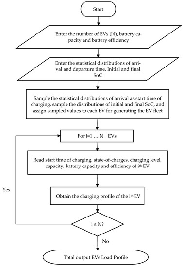 The sampled values of the influencing factors, as explained above, are processed to obtain the total charging profile of EVs. The flowchart in Figure 6 describes the step-by-step procedure for determining an uncoordinated load profile. The charging profiles for each EV in the fleet are consecutively created in the loop structure. Once all individual EV load profiles are created, they are summed to generate the overall load profile.