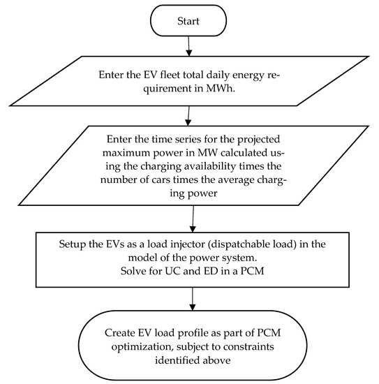 The authors developed an algorithm for modeling the uncoordinated charging and incorporated the result into the PCM model as a time series, similar to the load forecast or VRE forecast. However, coordinated charging modeling must be part of the PCM and modeled as a controllable load with the constraints imposed by the fleet characteristics, energy requirement (MWh), charging availability, and charging level (kW). Otherwise, the modeling will neglect the influence of the EV fleet on the electricity price.