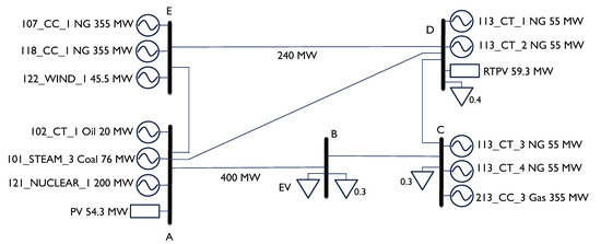The goal of creating the EV load models described above was to use them in studying the effects of EVs on the operation of an actual power system (e.g., the Western Interconnect in the U.S., a regional utility power system model, etc.). However, to show the effectiveness of the models, it is only necessary to use a simple transmission system model that contains loads, generators, and transmission linkages that are representative of an actual power system. Therefore, a simple 5-bus system, namely the “NAU 5-bus system” (NAU is the acronym for Northern Arizona University), was created, and is depicted in Figure 9. The generator types and capabilities, the renewable energy generation time series, and the load time series are representative of those found in the southwestern U.S.; it includes a subset of the variable renewable energies and generator characteristics from the Reliability Test System of the Grid Modernization Laboratory Consortium (RTS-GMLC) [43,44].