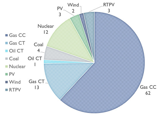 Proportion ratio (%) for the types of generators considered in the NAU 5-bus system (CC = combined cycle; CT = combustion turbine; PV = photovoltaics; RTPV = rooftop PV).