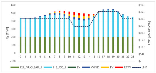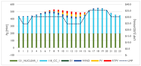 In the case of coordinated charging, Figure 14 shows the generation stack and LMPs. The system operation cost for the day was 359,330 USD. Relative to the plot shown in Figure 11, the system LMP increased between 1 a.m. and 2 a.m., which means that as the marginal generator increased its power dispatch due to the EV load, it increased a step in its cost curve. Figure 15 directly compares this point, plotting the EV charging profiles and the system LMPs. Regardless of this increase in LMP, the overall production cost was less than for the case of uncoordinated charging, as the charging occurred during the lower-cost (i.e., lower LMP) hours during the day.