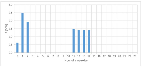 Implementing the coordinated charging modeling in the PSO resulted in the daily charging profile shown in Figure 13. Recall that the coordinated charging model used the LMP in combination with EV availability and battery SoC in determining the time to charge as part of the goal to minimize operating costs over the course of a day. Compared with the uncoordinated charging profile (Figure 12), most of the EV charging was moved to the low-LMP hours of the day (hours 1, 2, and 11 to 14). The total daily energy used in charging was the same as in the uncoordinated case (10.75 MWh), but the charging timing was shifted in a way that complied with EV charging availability, battery SoC, and daily charging requirement.